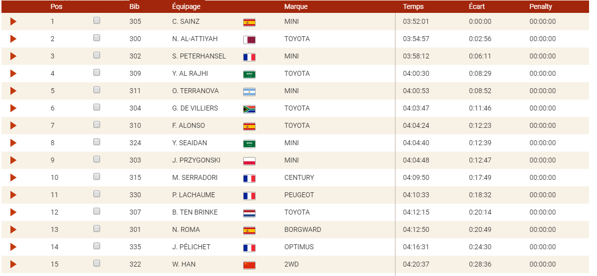 Carlos Sainz est talonné d’un peu moins de trois minutes par Nasser Al-Attiyah, tandis que Stephane Peterhansel termine troisième avec six minutes de retard de Sainz.