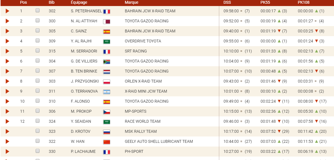 Malgré un écart de navigation, Stephane Peterhansel a réussi à accentuer son avance en tête de l’étape et devance à l’arrivée la Toyota pilotée par Nasser Al-Attiyah d’un peu plus de 2 minutes et l’autre Mini Buggy pilotée par Carlos Sainz Sr.
