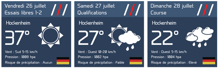 Vous pouvez à tout moment scruter l’évolution de la météo à Hockenheim en temps réel en cliquant sur ce lien qui vous redirige sur la page des prévisions heure par heure de notre partenaire météo Célinium.